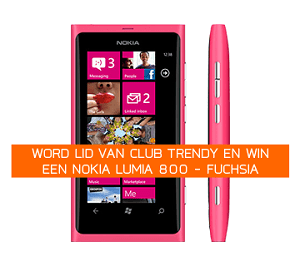 Alle Club Trendy leden hebben een kans om Nokia Lumia 800 – Fuchsia te winnen. De winactie begint vandaag en eindigt op 03 maart 2013. Word lid van Club Trendy vandaag, om deel te nemen aan de winactie en dit geweldige apparaat te winnen. Lees meer over Club trendy op onze website.
