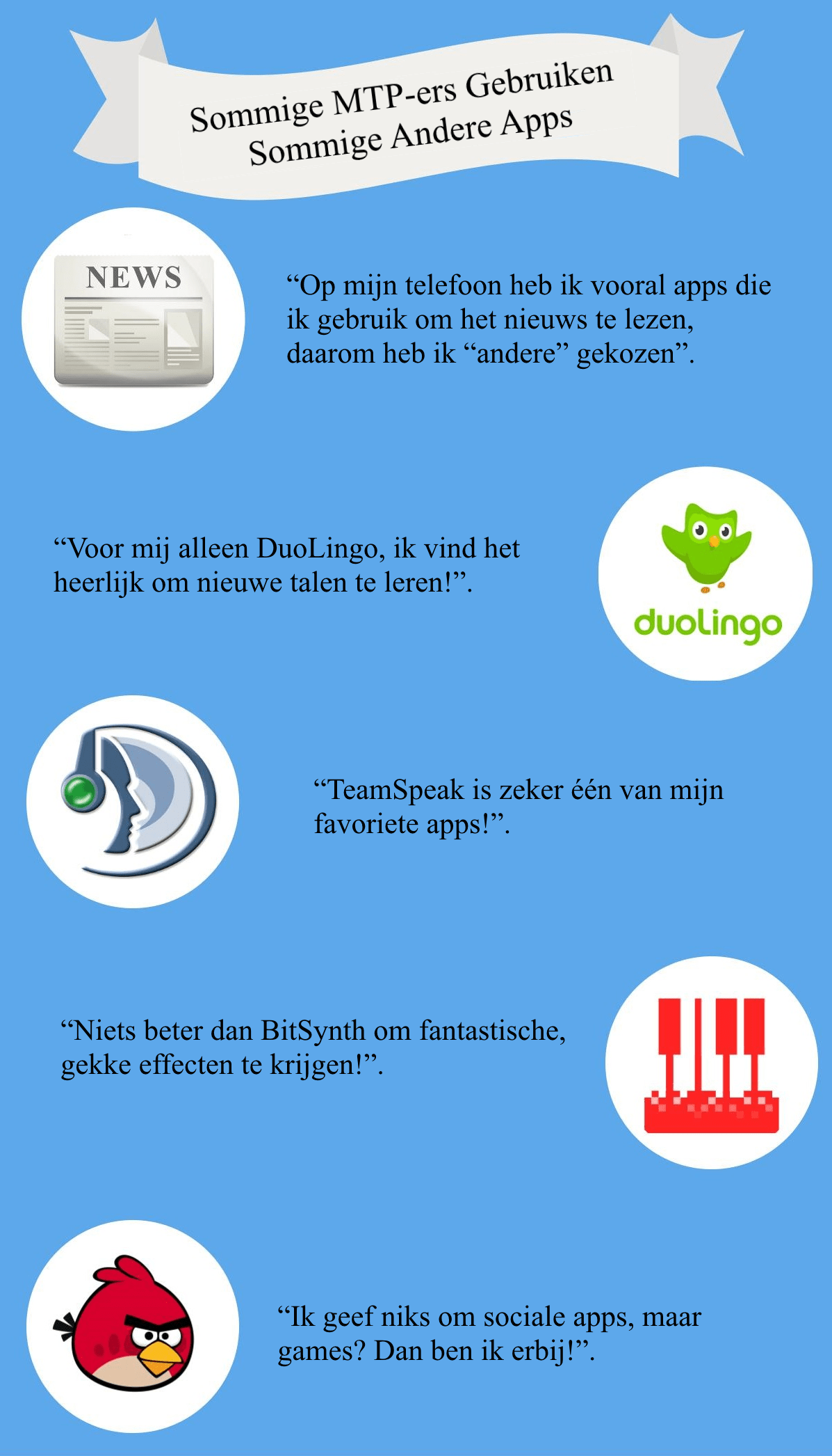 Er is een app voor bijna alles: Instagram zorgt dat uw foto’s er cool uitzien, Shazam herkent uw liedjes, FourSquare laat iedereen weten waar u bent, Google Maps helpt u om overal te komen en Facebook Messenger houdt u in contact met familie en vrienden. Als u bijvoorbeeld naar muziek wil luisteren, heeft u Pandora, 8tracks, SoundCloud en Spotify. En gamers zijn waarschijnlijk wel bekend met klassiekers als Subway Surfers, Clash of Clans, QuizUp en nog veel meer. Van gratis en optionele aankopen tot betaald, er is een app voor iedereen, zowel iOS als Android gebruikers. Hier bij MTP hebben we recentelijk een korte enquête gehouden om te zien welke apps favoriet zijn binnen onze muren, hieronder kunt u zien hoe we gestemd hebben.