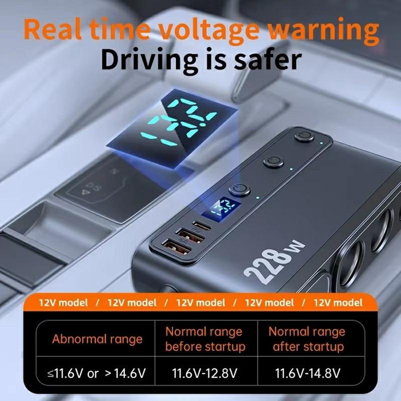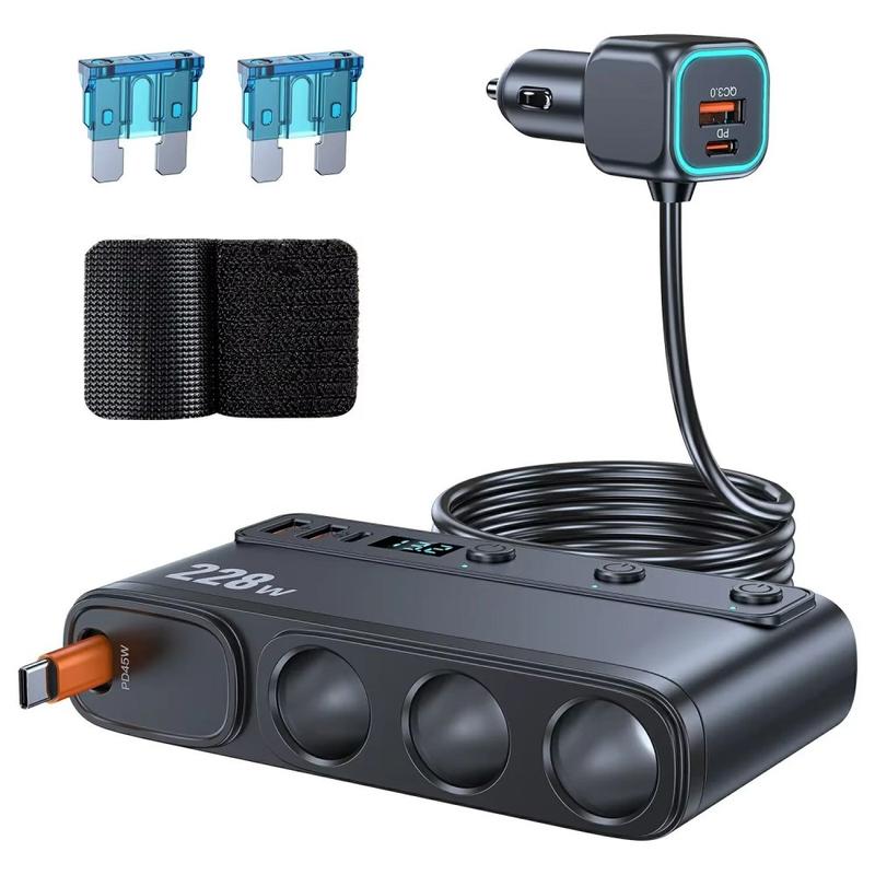 228W 9-in-1 autolader met sneloplaadbare aansteker-splitter met onafhankelijke schakelaars en LED-scherm - 3x QC3.0 USB-A, 2x PD USB-C, PD USB-C kabel, 3x aanstekeraansluiting