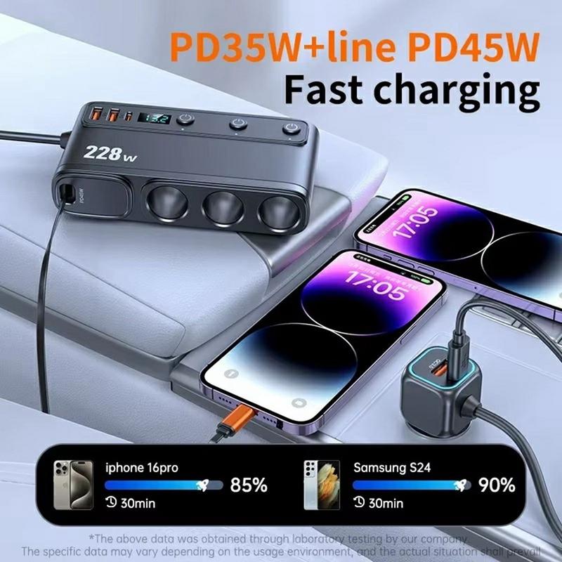 In plaats van te jongleren met meerdere opladers of zonder stopcontacten te zitten, biedt de 228 W 9-in-1 autolader u een alles-in-één stroomoplossing. Het combineert snelheid, controle en veiligheid, zodat je altijd verbonden en voorzien van stroom bent, waar je reis je ook brengt.