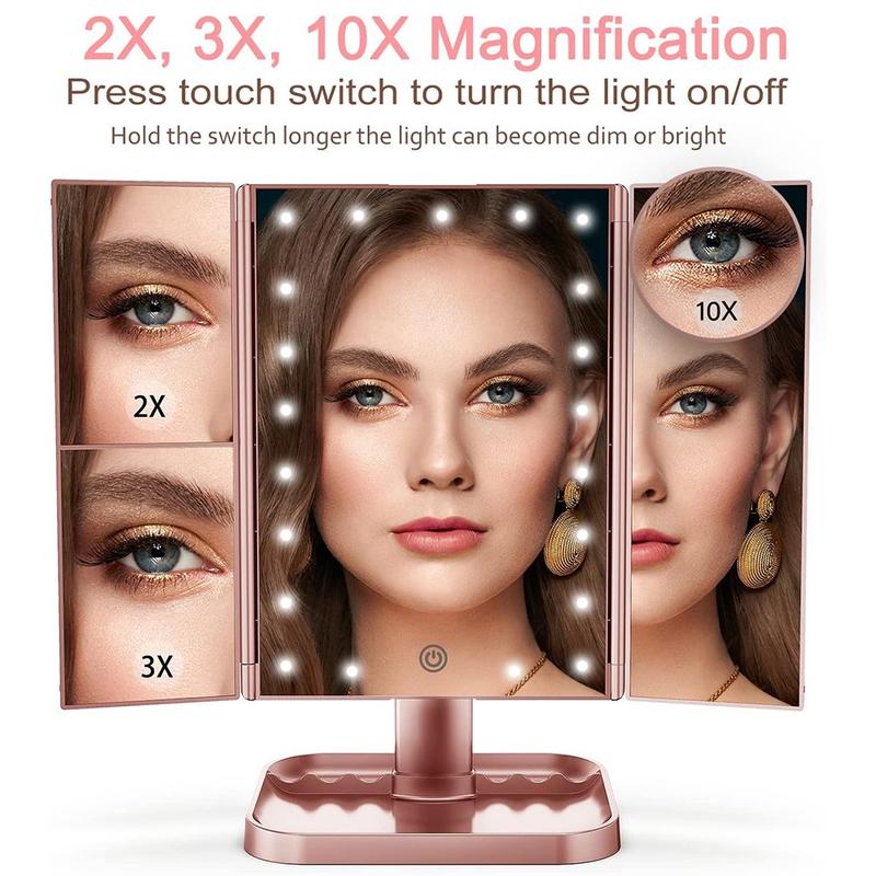 3-Zijdige opvouwbare make-upspiegel met 22 LED-lampjes - 1X/2X/3X/10X vergrotende make-upspiegel