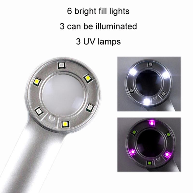Het vergrootglas bevat 6 heldere lampjes: 3 witte LED-lampjes voor heldere verlichting en 3 UV-lampjes voor speciale inspecties. Met de drukknop kan eenvoudig worden omgeschakeld tussen wit licht en paars UV-licht, voor verschillende kijkscenario's.