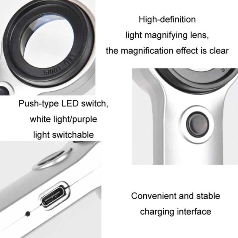 Het 30x handheld oplaadbaar vergrootglas is ontworpen voor gedetailleerde inspectie en duidelijke vergroting bij alledaagse en professionele taken. Met een high-definition glazen lens biedt het een scherpe, vervormingsvrije weergave voor close-up werkzaamheden zoals het identificeren van sieraden, het lezen van kleine lettertjes en het onderzoeken van kleine voorwerpen.