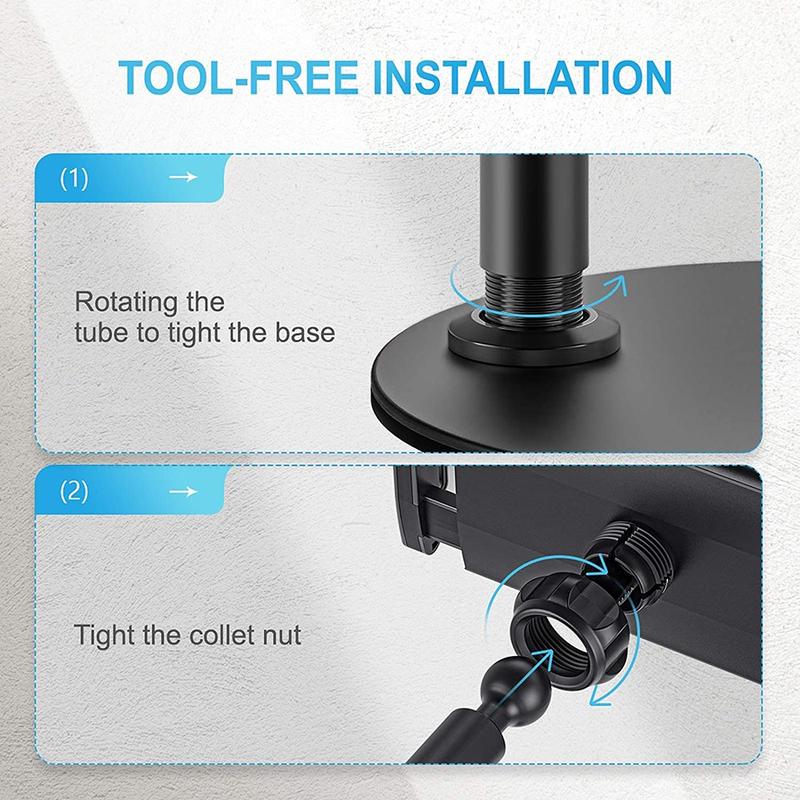 Installatie zonder gereedschap, gewoon de buis draaien om de basis vast te zetten en dan de moer vastdraaien