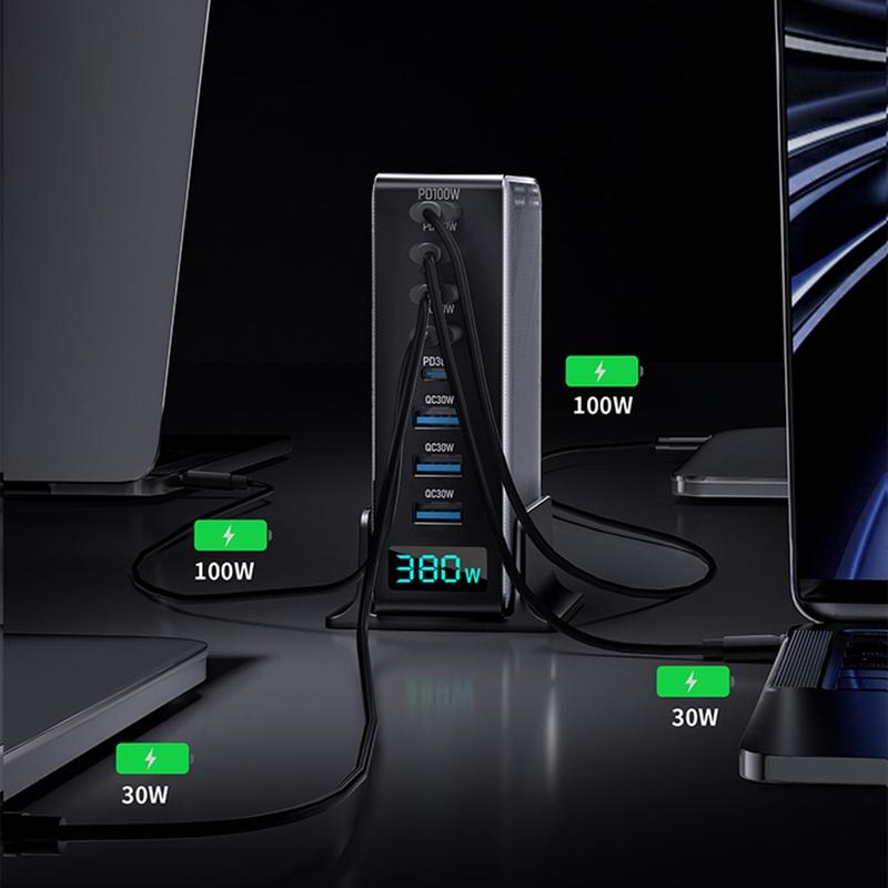 Laad je hele set-up op met een krachtig 380W GaN-bureaubladlaadstation dat is gebouwd voor moderne huizen en kantoren. Met 8 poorten (5x USB-C + 3x USB-A) en een digitaal energiedisplay kun je laptops, telefoons, tablets, koptelefoons, powerbanks en meer tegelijk opladen, terwijl je bureau schoon en georganiseerd blijft. GaN-technologie helpt bij het leveren van sterke prestaties in een compacte vorm, en ingebouwde veiligheidsvoorzieningen helpen het opladen stabiel en betrouwbaar te houden.