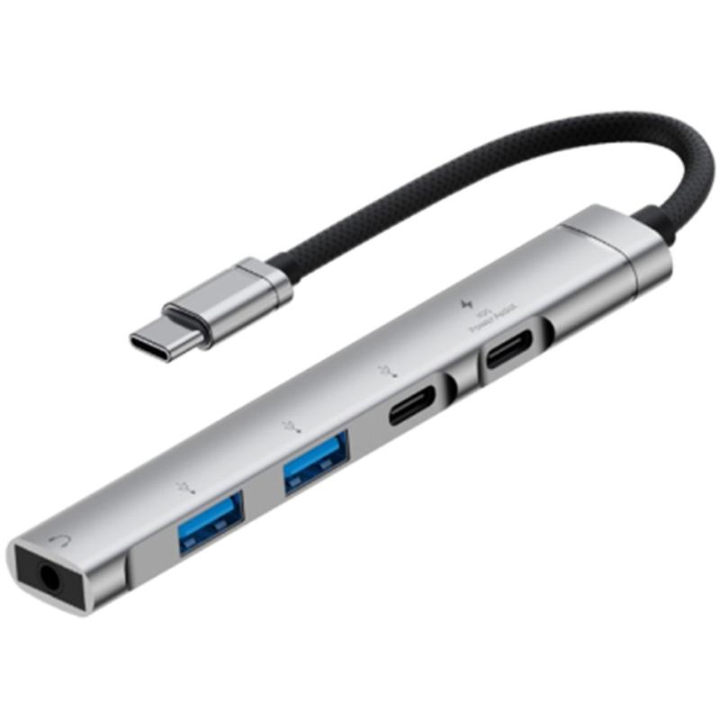• 5-in-1 multifunctionele USB-C hub van aluminiumlegering - 1x Type-C oplaadpoort, 1x Type-C datapoort, 2x USB 2.0, 3,5mm hoofdtelefoonaansluiting