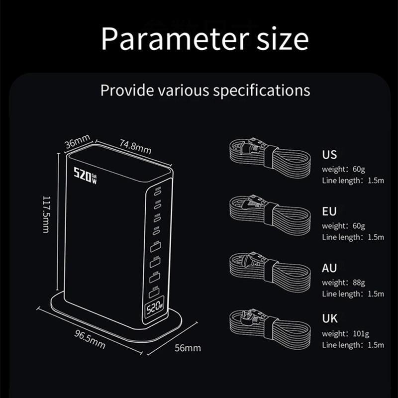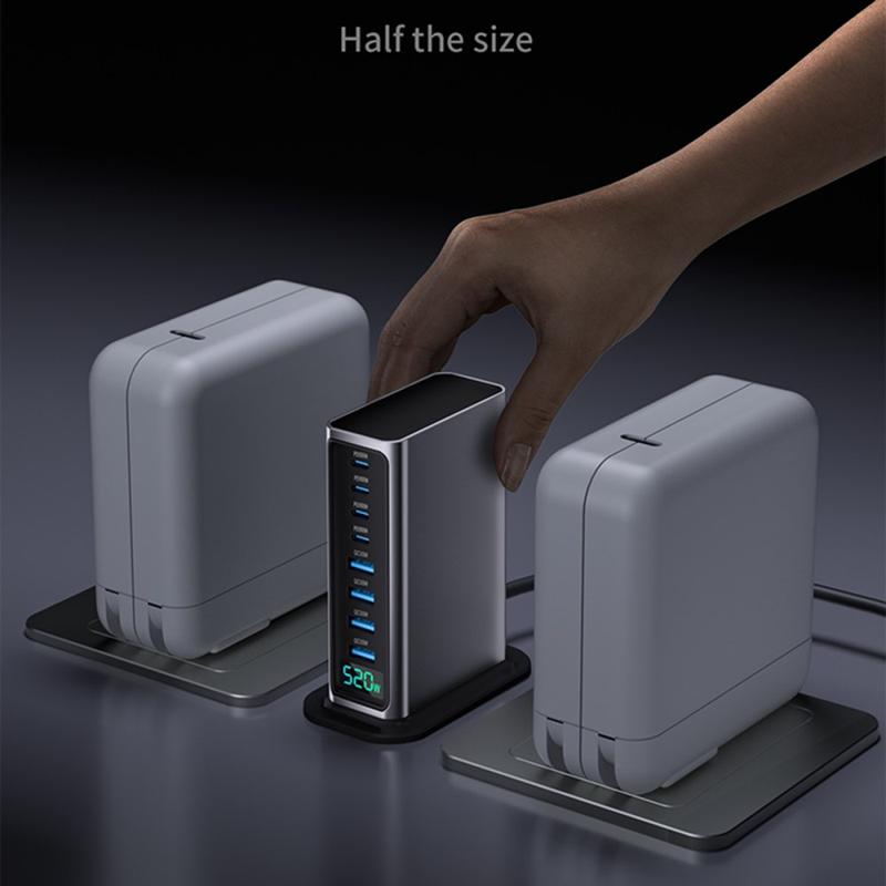 520W GaN 5.0 Desktop Oplaadstation met Digitale Vermogensweergave - 8 Poorten (4x USB-C tot 100W + 4x USB-A) Snellader, PPS/PD/QC