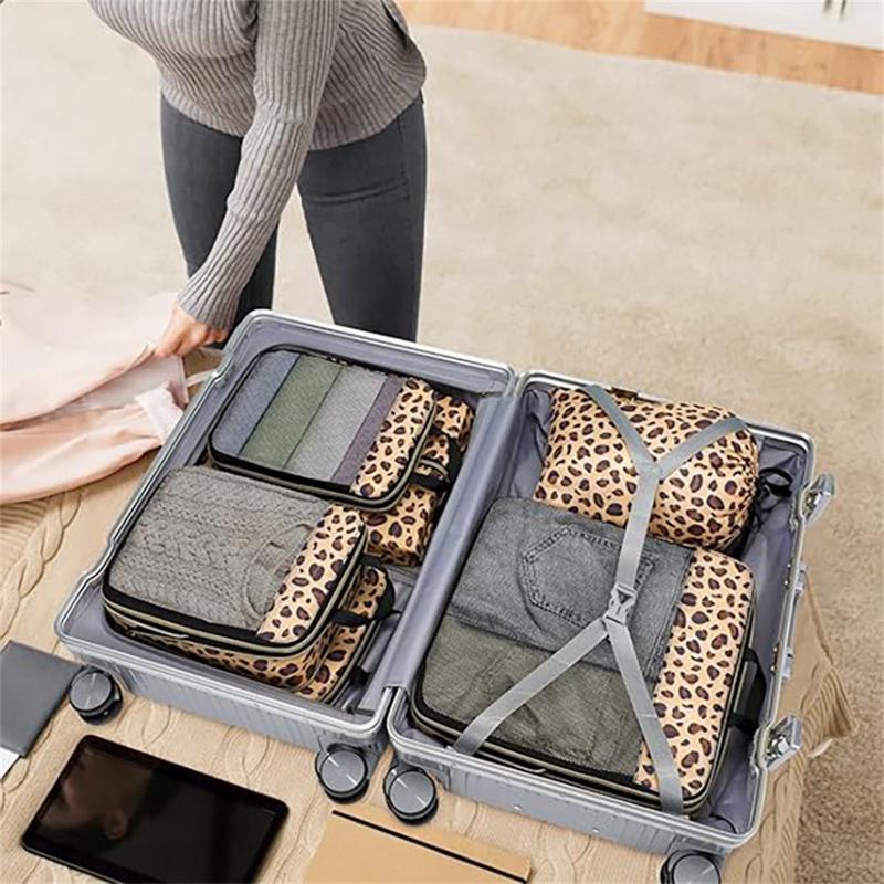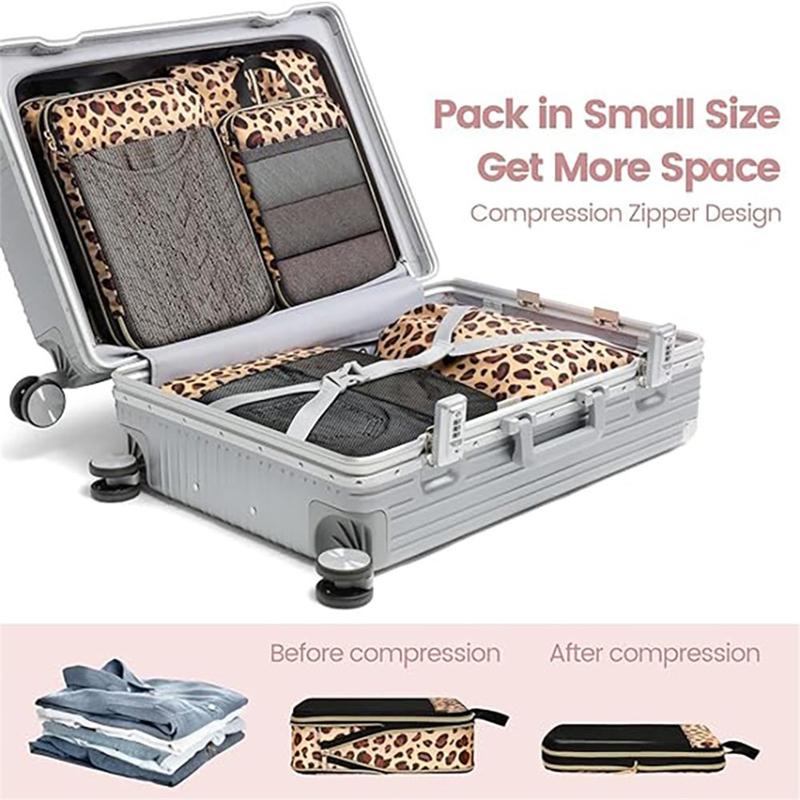 6-delig reisorganizerset met luipaardprint - ruimtebesparende compressietassen voor kleding en toiletartikelen