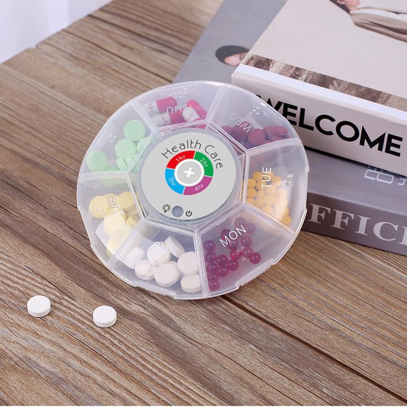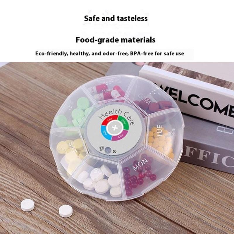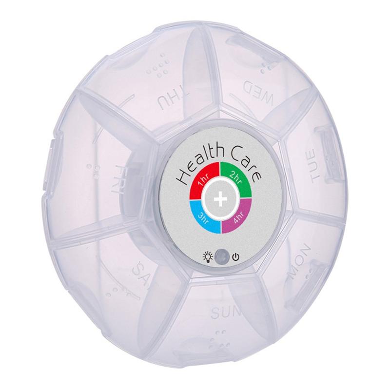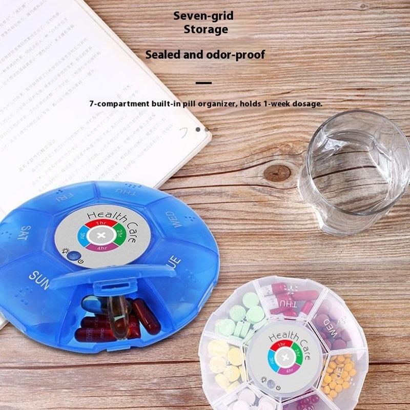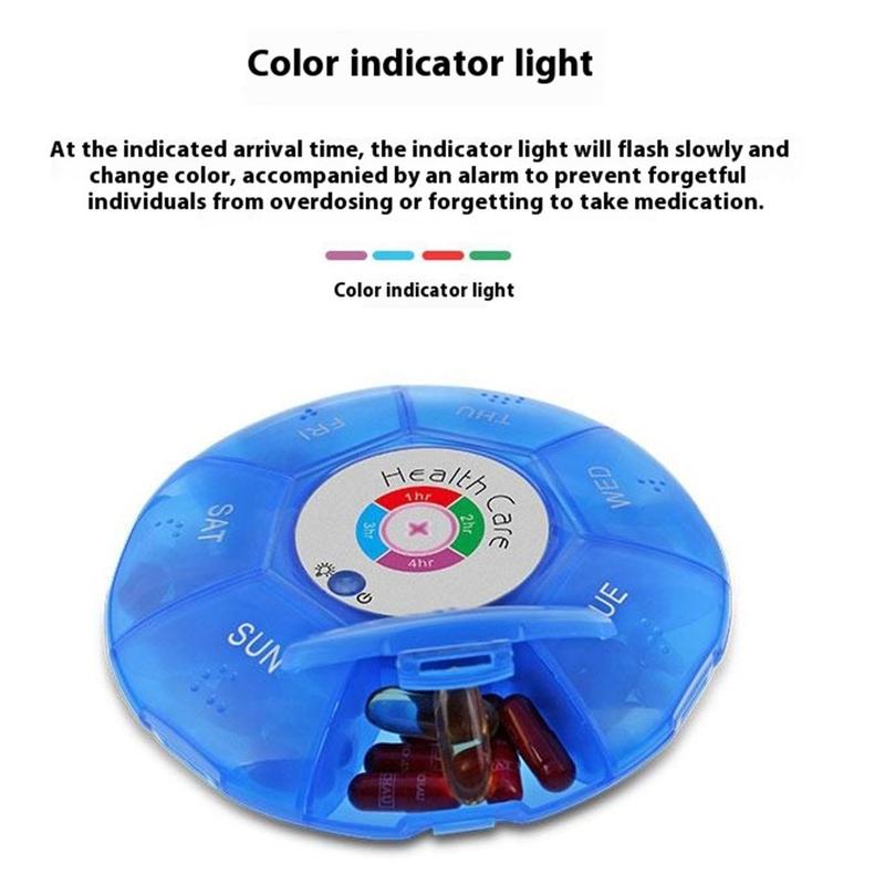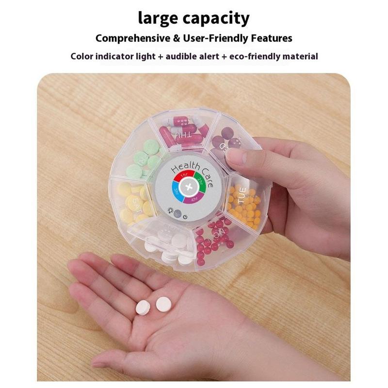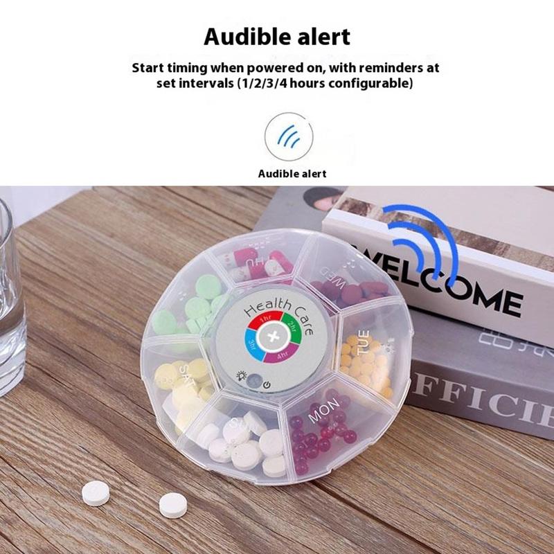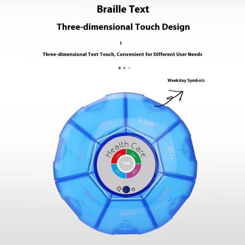 Blijf op de hoogte van elke dosis, zelfs als je op reis bent. Deze ronde pillendoos met zeven compartimenten combineert kleurveranderende LED's met hoorbare waarschuwingen, zodat je tot vijf herinneringen kunt programmeren met een interval van 1, 2, 3 of 4 uur. Braillehobbels en verhoogde weekdagpictogrammen houden de indeling overzichtelijk, terwijl een vochtbestendige, schokbestendige behuizing de tabletten beschermt in een handtas of handbagage.