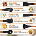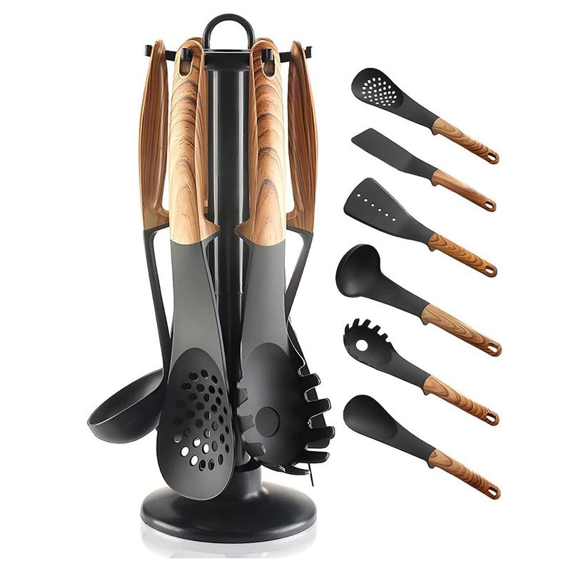 - Complete 7-delige kookcollectie - Bevat al je keukenbenodigdheden: soeplepel, schuimspaan, stevige lepel, schuimspaan, stevige spatel, pastaschep en een bijpassende opbergstandaard.
