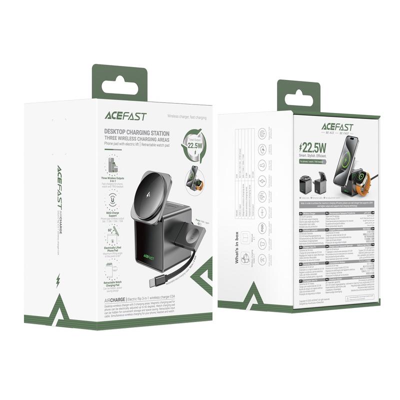 De ACEFAST E34 is een eersteklas 3-in-1 draadloos oplaadstation dat is ontworpen om je smartphone, smartwatch en oordopjes allemaal tegelijk van stroom te voorzien. Met een innovatieve elektrische klapstandaard kun je de kijkhoek van je telefoon aanpassen tijdens het opladen, waardoor het ideaal is voor videogesprekken, streamen of gebruik op een bureau. Met ondersteuning voor snel opladen tot 15 W levert de E34 efficiënt vermogen, terwijl de ingebouwde koeling en het intrekbare kabelbeheer je werkplek netjes en veilig houden. Dit compacte en duurzame oplaadstation is de perfecte alles-in-één oplossing voor thuis, op kantoor of onderweg.