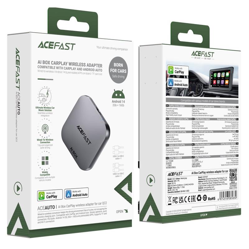De ACEFAST QC2 AI Box geeft je auto een directe moderne upgrade zonder je head-unit te vervangen. De snelle draadloze connectiviteit, entertainmentmogelijkheden, het draagbare ontwerp en de opslaguitbreiding maken het een uitstekende oplossing voor bestuurders die op zoek zijn naar gemak, comfort en flexibiliteit. Of je nu navigeert, streamt of handsfree belt, deze compacte adapter verbetert elke reis.