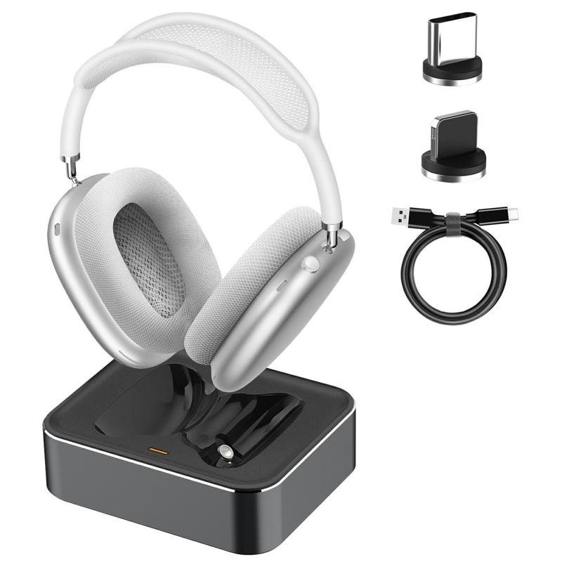 De standaard ondersteunt de slimme slaapstand wanneer de hoofdtelefoon is geplaatst, waardoor het batterijverbruik wordt verminderd, en maakt snel weer verbinding wanneer je hem weer oppakt. Een LED-indicator geeft in één oogopslag de oplaadstatus weer, terwijl de meegeleverde USB-C- en Lightning-connectoren hem compatibel maken met verschillende generaties AirPods Max.