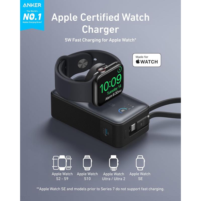 Anker MagGo 10000mAh Power Bank met Apple Watch-oplader en ingebouwde USB-C-kabel - 35W