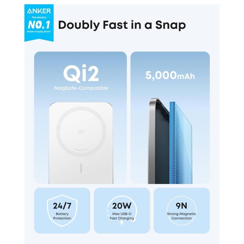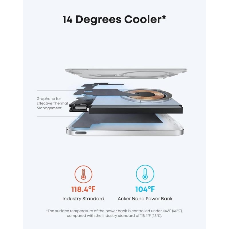 De Anker Nano Power Bank is ontworpen voor gebruikers die snel en veilig willen opladen zonder een logge powerbank mee te nemen. Dankzij de magnetische bevestiging is opladen eenvoudig en zonder kabels, terwijl de USB-C-poort extra flexibiliteit biedt wanneer sneller opladen via een kabel nodig is. Met geavanceerde koel- en veiligheidsfuncties levert het betrouwbare prestaties in een compact, premium ontwerp.