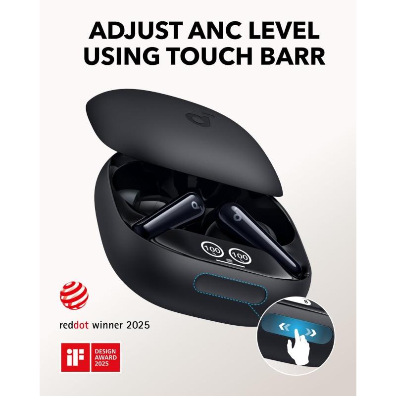 - Slimme oplaadbehuizing met aanraakbalk en display voor snelle ANC-bediening