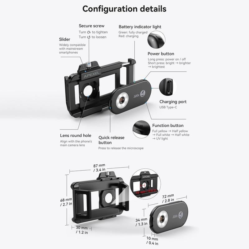 Verander je smartphone in een krachtige draagbare microscoop met de APEXEL APL-MS300 300X clip-on microscooplens. Dit compacte opzetstuk is ontworpen met optiek van professionele kwaliteit en geavanceerde verlichtingssystemen en brengt vergroting op laboratoriumniveau direct naar je telefoon - perfect voor liefhebbers van wetenschap, docenten, juweliers en technici.