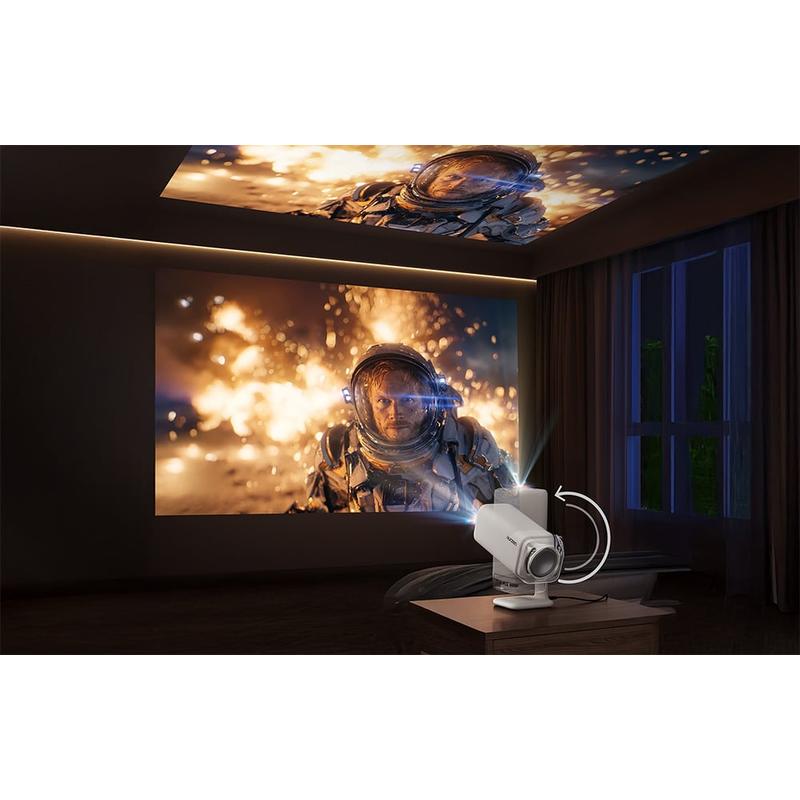 De installatie is ontworpen om snel en handsfree te verlopen. Real-Time Focus maakt gebruik van ToF-afstandsmeting om het beeld scherp te houden, terwijl elektrische keystone-correctie de geometrie automatisch aanpast wanneer de projector onder een hoek staat. Auto Screen Alignment past het beeld aan uw projectieoppervlak aan en Auto Obstacle Avoidance helpt het beeld helder te houden wanneer er iets in de weg staat. Dankzij de verstelbare voet (tot 110 graden) kunt u gemakkelijk op een muur of het plafond projecteren, en dankzij het compacte ontwerp en USB-C-stroomondersteuning kunt u het apparaat mee naar buiten nemen met een geschikte PD-oplader of powerbank.