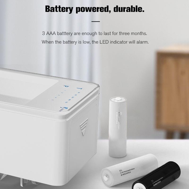 - Werkt op batterijen met een alarm voor lege batterijen: Werkt op 3 AAA-batterijen (niet meegeleverd), gaan tot drie maanden mee; heeft een LED-indicator die waarschuwt als de batterij bijna leeg is.
