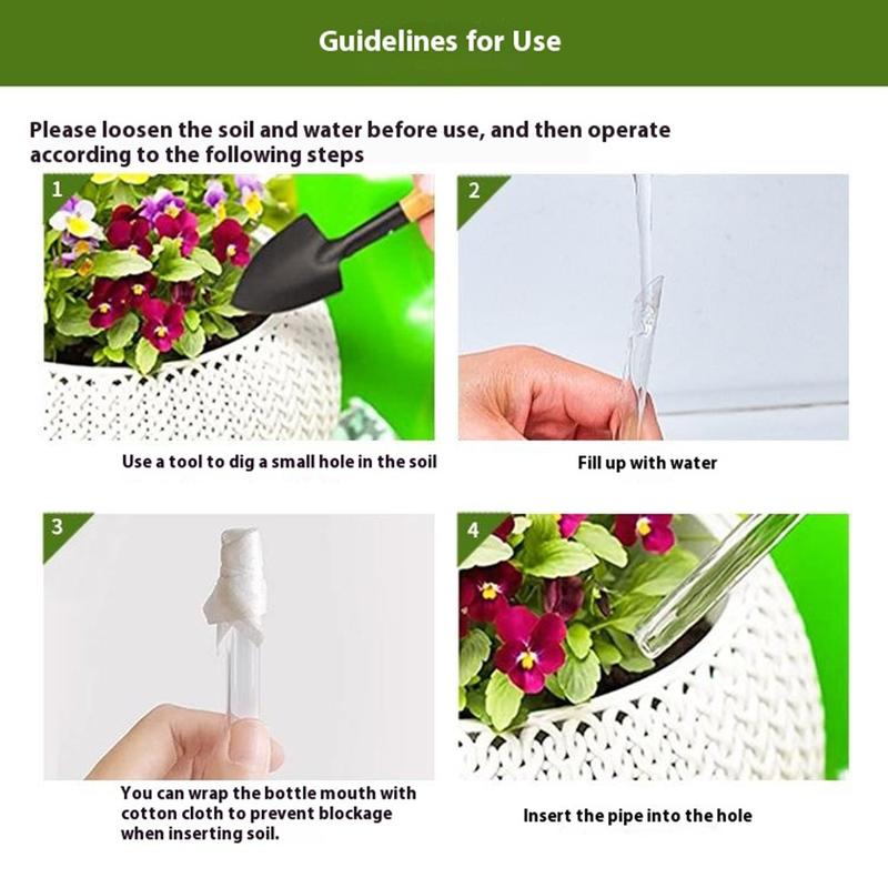 Het gebruik van de bollen is moeiteloos - gewoon vullen met water en in de grond steken onder een hoek van 75°-85°. Eenmaal op hun plaats regelen de bollen automatisch de bewatering zonder dat er gereedschap of een ingewikkelde installatie nodig is.