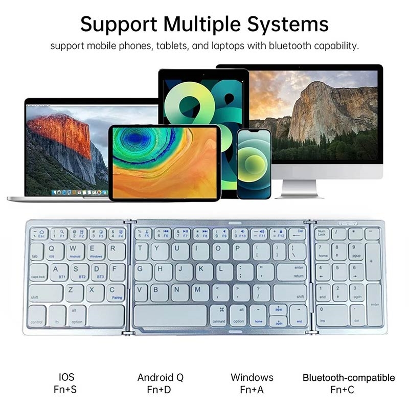 Dankzij het slimme driemaal opvouwbare ontwerp is het toetsenbord gemakkelijk mee te nemen in een tas, rugzak of laptoptas, terwijl de magnetische sluiting ervoor zorgt dat het tijdens het vervoer stevig opgevouwen blijft. Met ondersteuning voor maximaal drie Bluetooth-apparaten kunt u soepel schakelen tussen uw telefoon, tablet en laptop met behulp van de speciale BT1-, BT2- en BT3-toetsen. Dit maakt het toetsenbord bijzonder handig voor multitasking op verschillende apparaten en besturingssystemen.