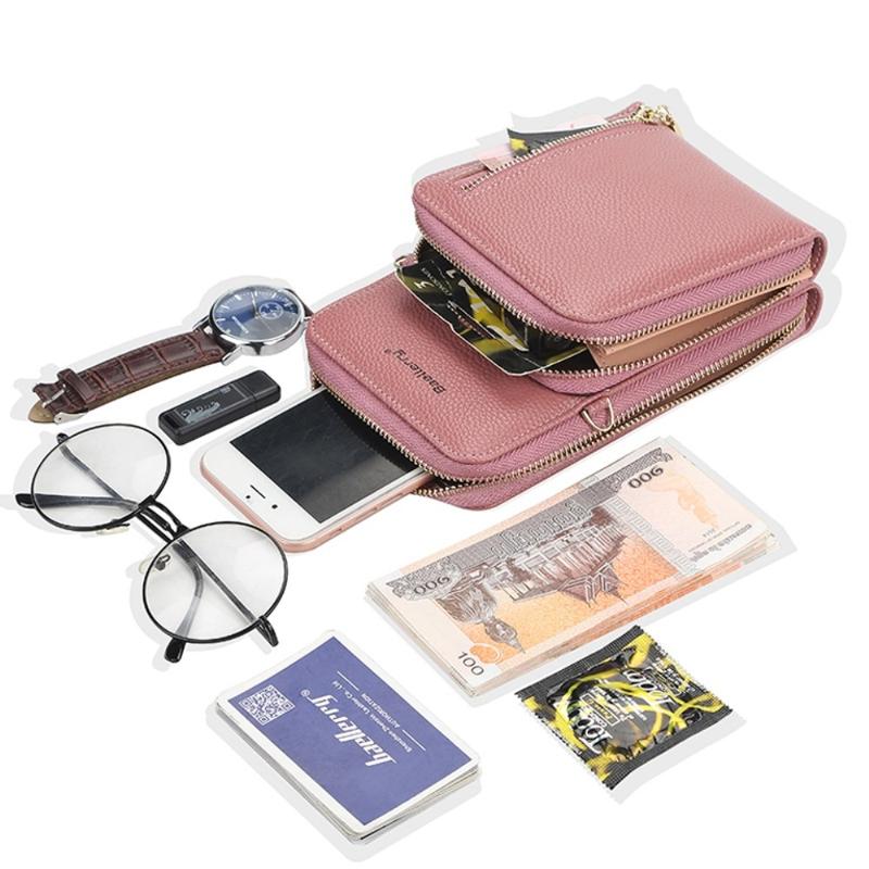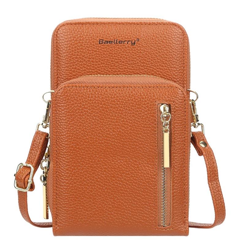 BAELLERRY N0110 Vrouwen Dubbele Laag Ritssluiting Portemonnee PU Leer Cellphone Portemonnee met Schouderriem - Bruin