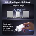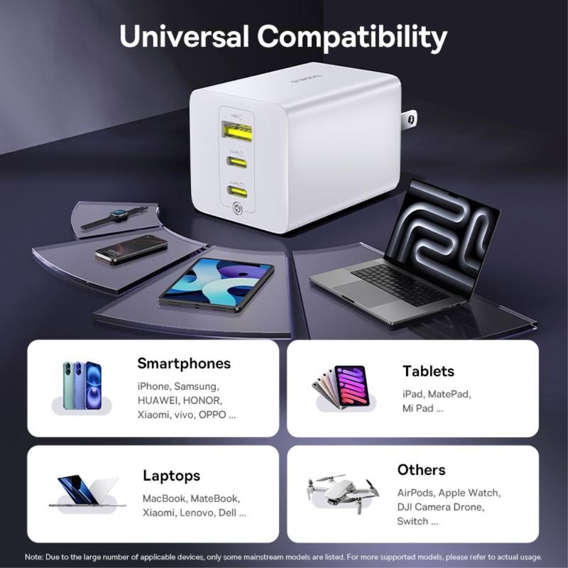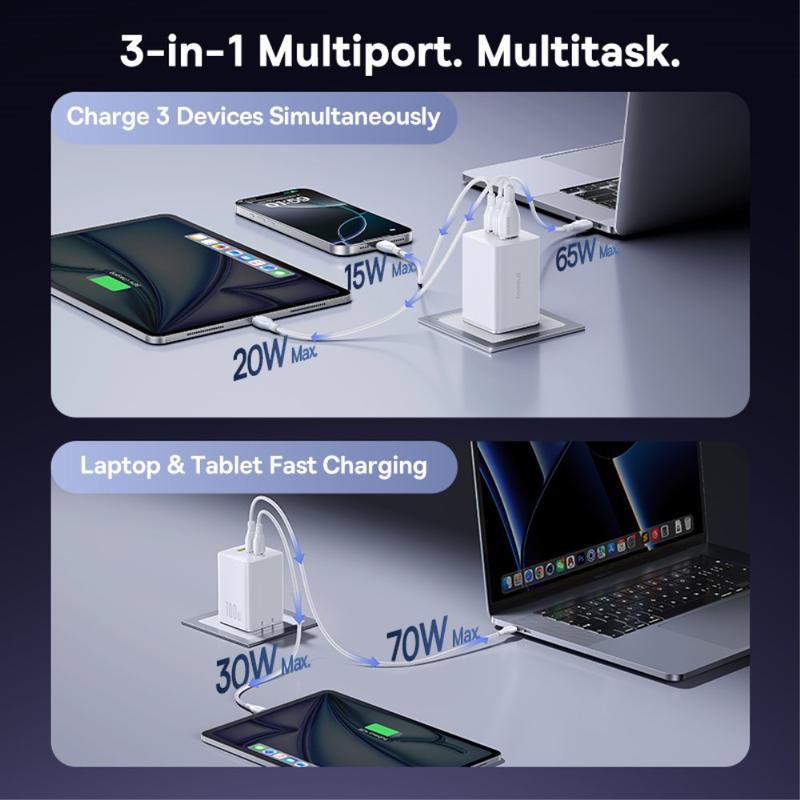 - Intelligente stroomverdeling: 70 W + 30 W op dubbele USB-C, of 65 W + 20 W + 15 W op alle drie de poorten
