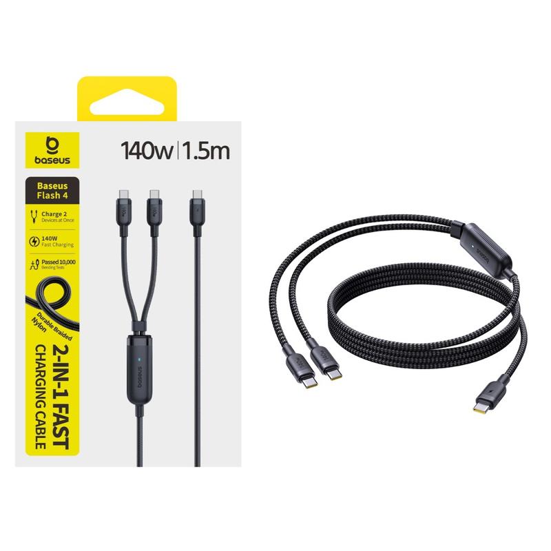 Laad twee apparaten op via één kabel met de BASEUS Flash 4 2-in-1 snellaadkabel. Deze slimme oplaadkabel is ontworpen voor moderne USB-C-apparaten en combineert een hoog uitgangsvermogen, brede compatibiliteit en praktisch kabelbeheer in één reisvriendelijke oplossing. Hij ondersteunt maximaal 140 W voor het opladen van één apparaat en kan het vermogen ook intelligent verdelen over twee apparaten tegelijk, waardoor hij ideaal is voor laptops, tablets, telefoons, draagbare consoles en meer.