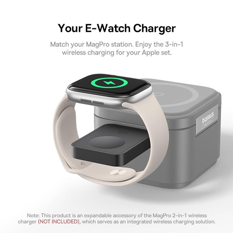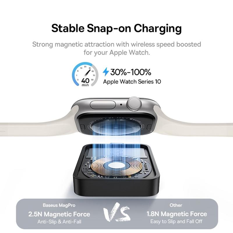 Ervaar gemak op een hoger niveau met de Baseus MagPro Magnetic Wireless Charger voor Apple Watch. Ontworpen met krachtige magneten en MagSafe ondersteuning, klikt deze 2.5W lader eenvoudig op je horloge voor veilig, efficiënt opladen thuis, op kantoor of onderweg. Hij is compact en licht en past moeiteloos in elke tas of zak, zodat je je horloge altijd van stroom kunt voorzien, waar je ook bent.