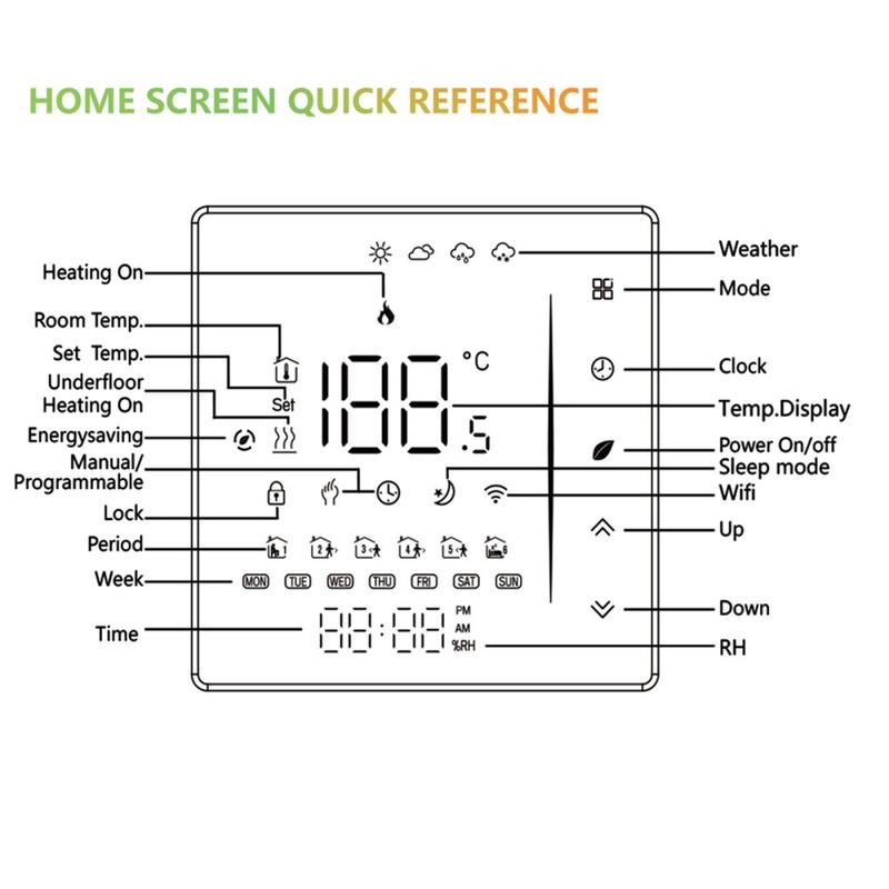 Deze thermostaat heeft een stijlvolle frameloze voorkant met een 3,0-inch LCD-scherm en een 2,5D gebogen rand voor een strakke, moderne uitstraling. Verborgen capacitieve aanraakknoppen zorgen voor een minimalistische look en maken de bediening eenvoudig en intuïtief. Dankzij het meerkleurige LED-scherm kunt u de instellingen en de omstandigheden in de kamer in één oogopslag controleren.