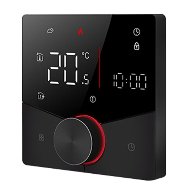 Deze thermostaat heeft een stijlvol, ultradun inbouwpaneel dat netjes in de muur past voor een strakke en moderne afwerking. De frameloze voorkant met afgeronde hoeken geeft hem een verfijnde uitstraling die gemakkelijk past bij verschillende interieurstijlen. Het LED-scherm biedt een duidelijk overzicht van de temperatuurwaarden en instellingen, terwijl de capacitieve aanraakknoppen een soepele en nauwkeurige bediening mogelijk maken met een simpele tik.