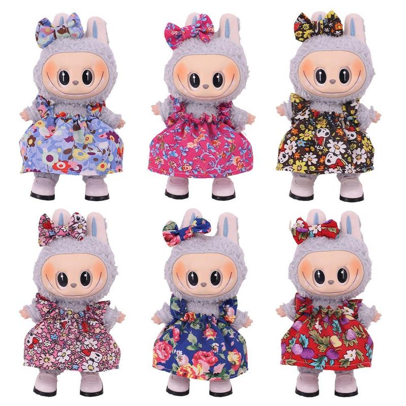 Bloemen Feestjurk & Strikjeshoofdband voor 17cm Labubu Minifiguur - Lichtgewicht Cotton-Blend Outfit, Makkelijk Jurk Ontwerp