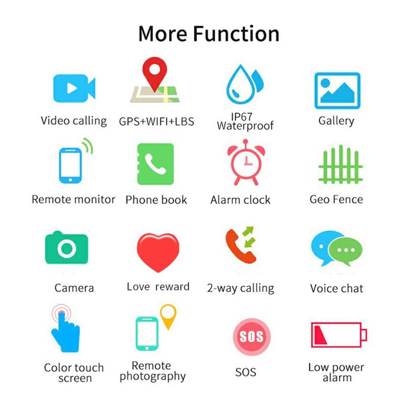 - APP-functie: Telefoonboek, intercom, telefoon bellen, stap, wekker, positie, informatie centrum, liefde beloningen, op afstand foto's, video-oproepen, SOS herinneren, werk, familieleden, een klasse, SMS-waarschuwingen, LBS, horloge vinden, schakelen Instellingen, taal, tijdzone, het verzamelen van horloges SMS, geweigerd om vreemde oproepen, uitschakeling op afstand, op afstand opnieuw opstarten en reset het apparaat