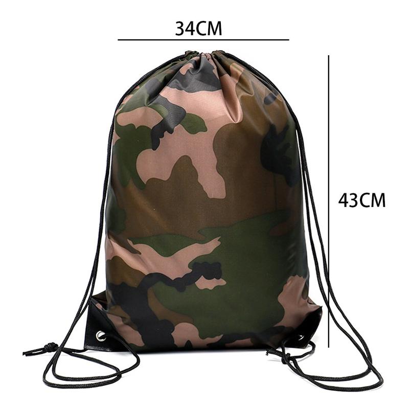 De camouflage rugzak met trekkoord is een duurzame en lichtgewicht opbergoplossing voor een actieve levensstijl. Hij is gemaakt van 210D polyester met met PU leer verstevigde hoeken en is ontworpen om dagelijks gebruik te weerstaan terwijl je spullen veilig opgeborgen blijven. Met een ruim hoofdvak en eenvoudige trekkoordsluiting is deze veelzijdige rugzak ideaal voor de sportschool, sport, reizen, kamperen of dagelijks gebruik.