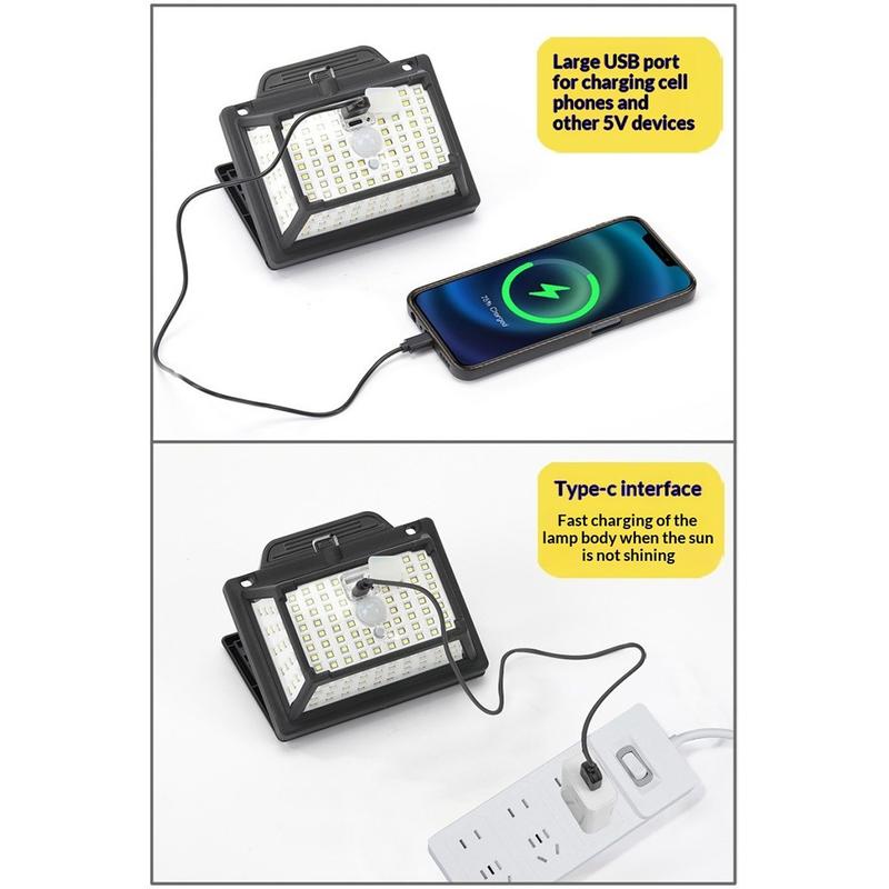 CCP087 190 LED-bewegingssensorlamp op zonne-energie - IP65 waterdichte, in twee delen opgebouwde tuinlamp voor buiten met zonnepaneel en Type-C-oplaadpoort