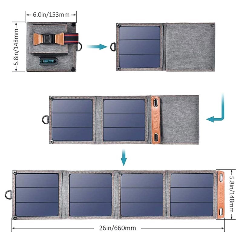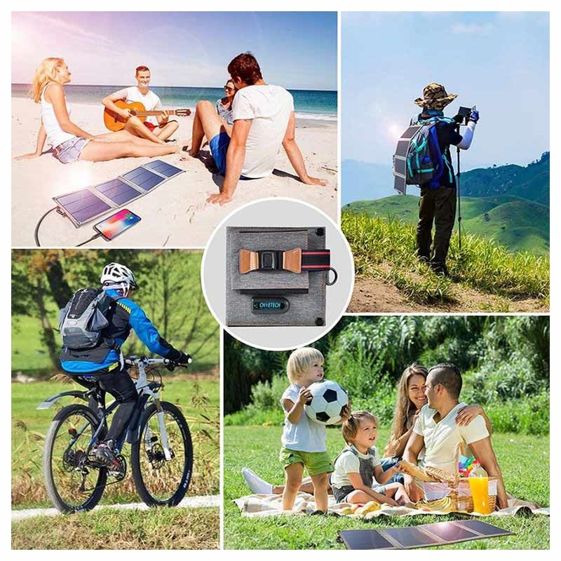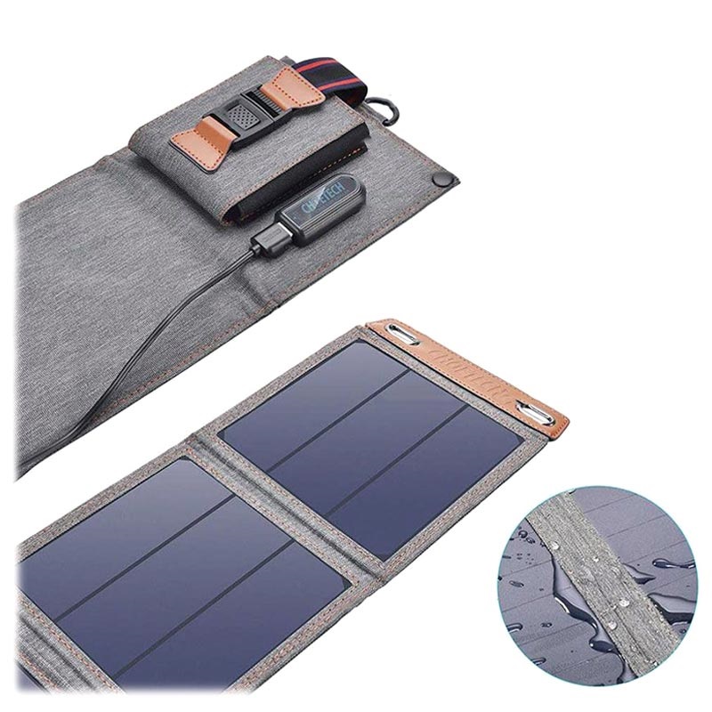 Het Choetech zonnepaneel met een totaal vermogen van 14W kan je apparaten veilig en efficiënt opladen via de USB-A poort. Maak snel gebruik van uw smartphone, tablet, GPS-tracker, digitale camera, mp3-speler of powerbank met alleen de energie van de zon. Een ingebouwde slimme chip detecteert automatisch het aangesloten apparaat en levert het optimale vermogen om veilig opladen te garanderen. De Choetech zonnelader is ideaal voor alle buitenactiviteiten zoals kamperen, wandelen en fietsen en dankzij waterdichte panelen kun je hem in alle weersomstandigheden in je rugzak dragen.