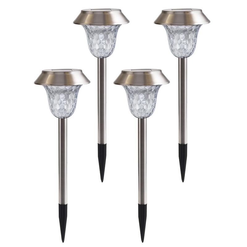 - Vier lampen, één minuut installatie - Duw de puntige palen in de grond - geen bedrading, geen gereedschap.