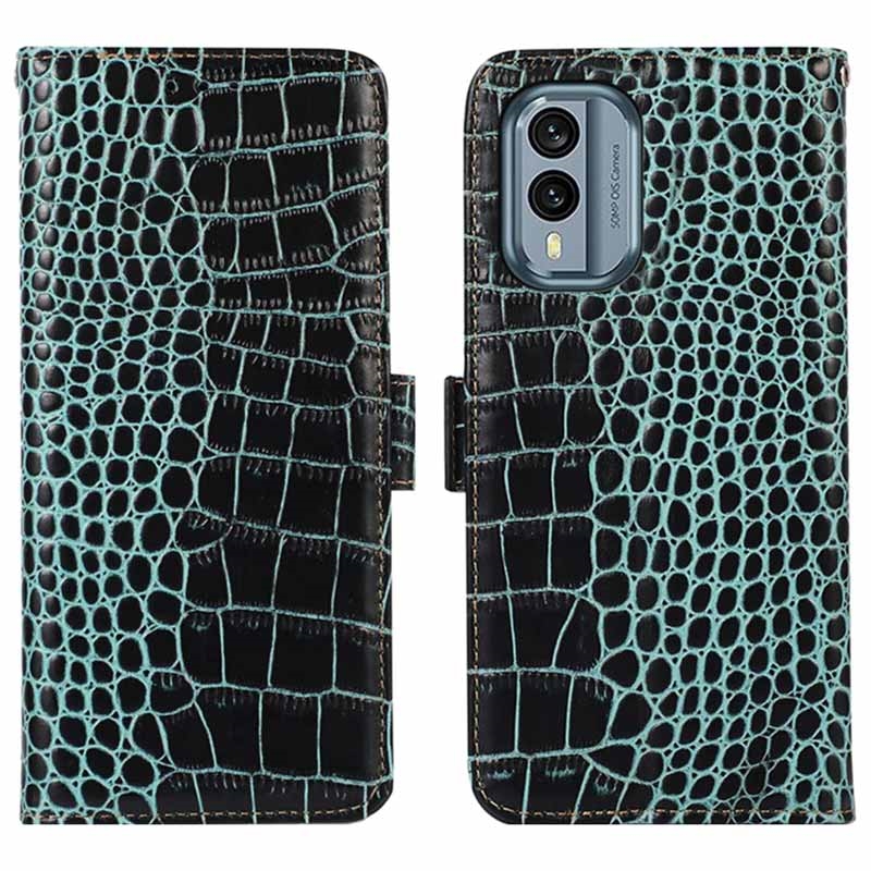 Stijl het uiterlijk van je Nokia X30 met deze uitzonderlijke leren portemonnee-hoes met een patroon van krokodillenleer. Uitgerust met verschillende kaartsleuven, een geldvak en RFID-blokkerende technologie, zal het uw portemonnee effectief vervangen. De magnetische sluiting houdt de case vast en het slimme ontwerp maakt gebruik als standaard mogelijk.