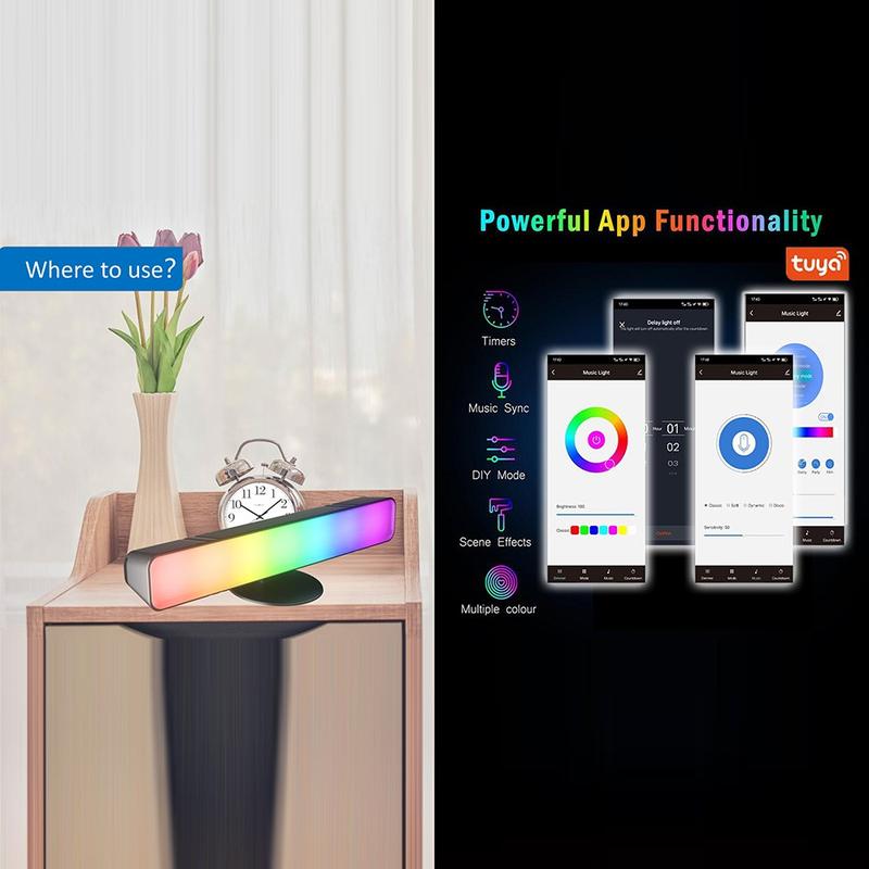 Geef je bureau een upgrade met de D04 2-delige RGB-desktopverlichtingsset, ontworpen om een meeslepende sfeer te creëren voor gaming, films en muziek. Kies uit 16 miljoen kleuren, dynamische cyclische effecten en DIY-scènemodi die passen bij je stemming, je kamer of je content. Elke lichtbalk heeft een ingebouwde microfoon die omgevingsgeluid oppikt, waardoor muzieksynchronisatie-effecten in realtime reageren op beats en stemmen voor een levendigere sfeer.