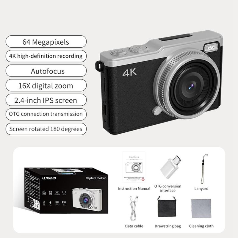 D72 draagbare digitale camera 4K - 2,4" CCD-camera met 16X zoom, autofocus, 180 graden kantelbaar scherm en 32GB kaart