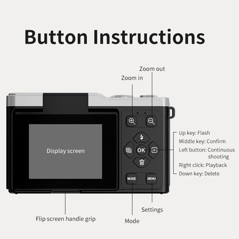 Leg elk onvergetelijk moment vast in levendige helderheid met de D72 4K draagbare digitale camera. Deze compacte maar krachtige camera is ontworpen voor ontwerpers, reizigers en fotografieliefhebbers, maakt opnamen in Ultra HD 4K-resolutie en biedt 16X digitale zoom voor verbluffende details vanaf elke afstand. Met het 2,4 inch 180° flipscreen kun je eenvoudig perfecte selfies en creatieve hoeken inlijsten, terwijl het autofocussysteem elke keer weer zorgt voor scherpe, levensechte beelden. Met meerdere opnamemodi, waaronder time-lapse, burst en intervalfotografie, geeft de D72 je creatieve vrijheid om je verhaal op jouw manier te vertellen. Het retro-geïnspireerde ontwerp combineert moderne prestaties met een tijdloze stijl en met de meegeleverde geheugenkaart van 32GB kun je meteen aan de slag.