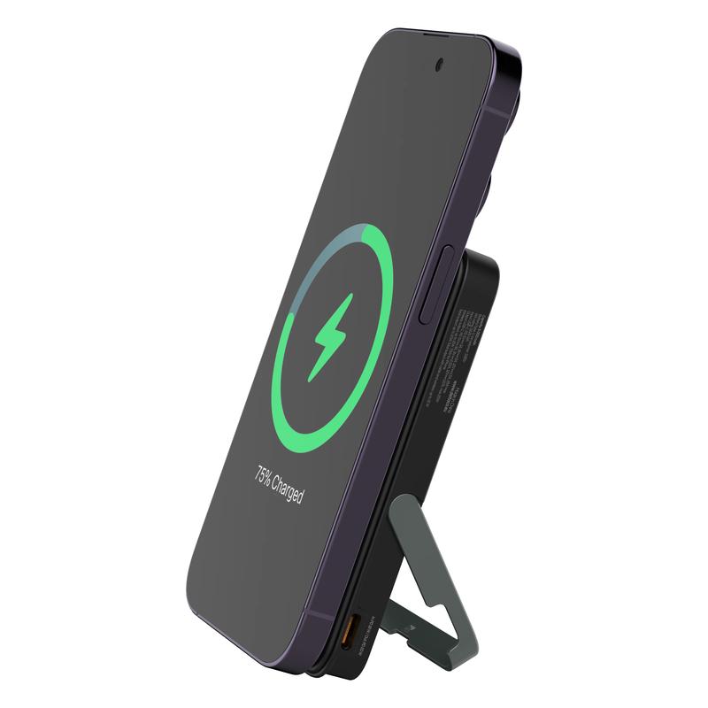 Met tot 15 W draadloos opladen voor compatibele apparaten en tot 7,5 W voor iPhones maakt het kabelvrij opladen eenvoudig. De ingebouwde magneet is compatibel met de magnetische oplossing van Apple en vergelijkbare systemen, waardoor de powerbank tijdens gebruik goed op zijn plaats blijft. De geïntegreerde standaard zorgt voor extra flexibiliteit, waardoor het gemakkelijker wordt om video's te bekijken, te browsen of deel te nemen aan gesprekken terwijl uw telefoon oplaadt.
