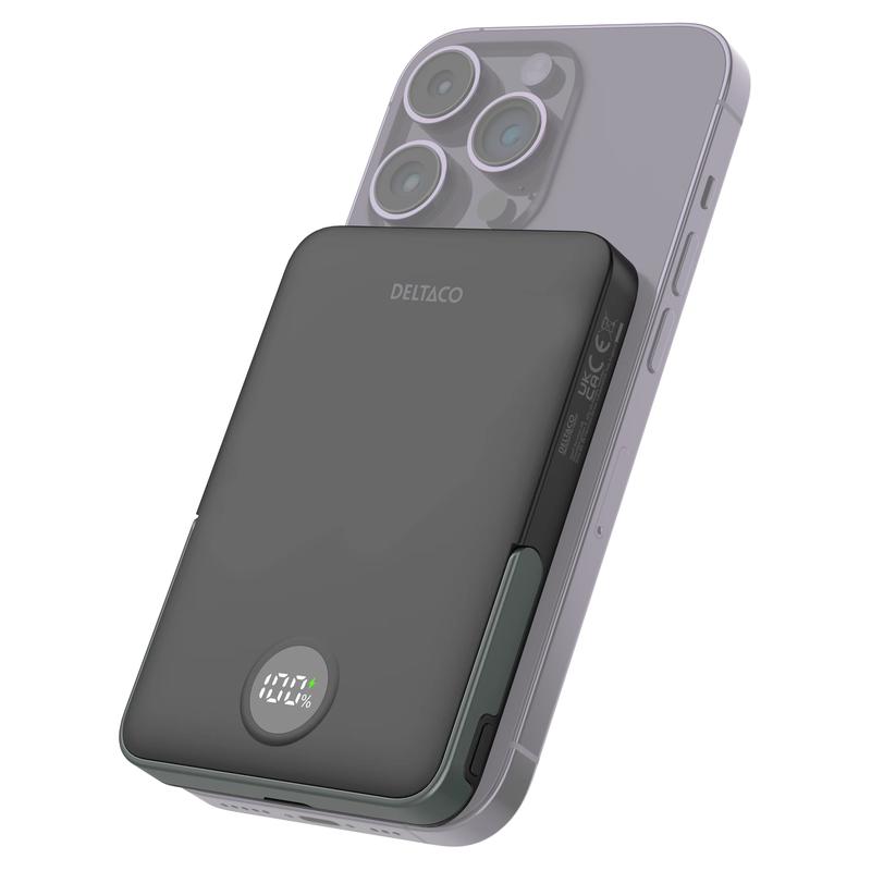 Houd extra stroom binnen handbereik met de Deltaco 5000mAh magnetische draadloze powerbank. Deze compacte, draagbare oplader is ontworpen voor dagelijks gebruiksgemak en combineert draadloos opladen, snel opladen via USB-C PD en een ingebouwde standaard in één praktisch apparaat. Het is een uitstekende keuze voor woon-werkverkeer, reizen, werkdagen en als back-up voor dagelijks gebruik wanneer je een eenvoudige en nette stroomoplossing nodig hebt.