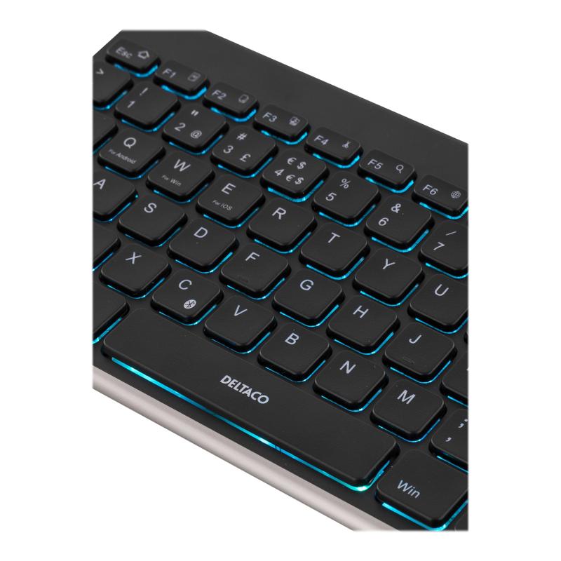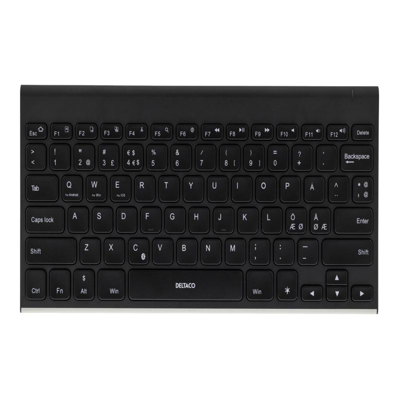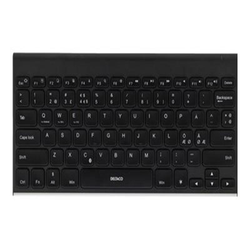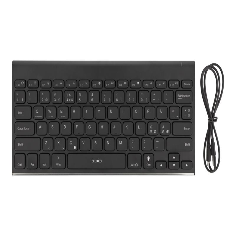 DELTACO trådløst minitastatur, lave taster, baggrundsbelyst, indbygget batteri, Bluetooth, 10m, sort.