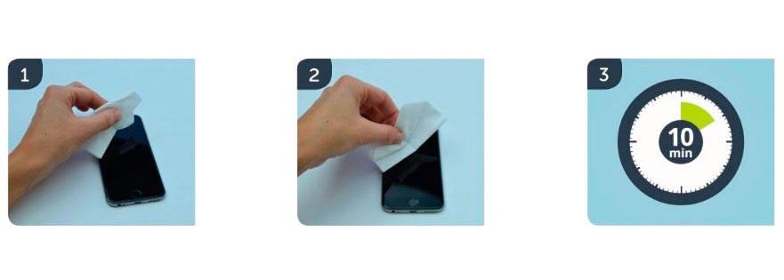 1. Gebruik het natte doekje nr. 1 (alcoholdoekje) om stof en vuil van het glazen scherm te verwijderen (en indien van toepassing ook van de lens van de achtercamera).