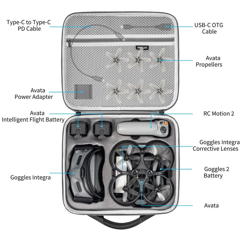 - Aangepast ontwerp: Deze koffer is speciaal ontworpen voor de DJI Avata en is voorzien van nauwkeurige compartimenten voor het veilig opbergen van de drone, afstandsbediening, accu's, oplaadadapter, oplader, duikbril en extra kleine accessoires.