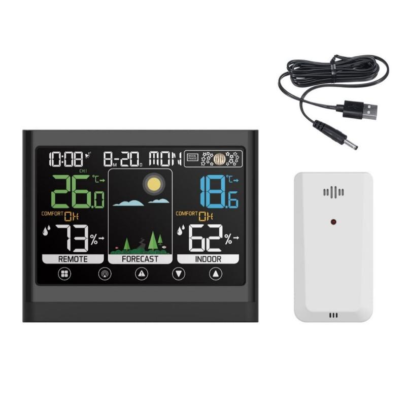 Deze weerklok biedt een 12-24-uursvoorspelling met behulp van 6 weerpictogrammen, waardoor u uw dag gemakkelijker kunt plannen. Het ondersteunt zowel binnen- als buitentemperatuur- en vochtigheidsmonitoring, waardoor het handig is voor het bijhouden van de omstandigheden in uw huis, tuin, balkon, kas of andere buitenruimtes. Met zeer nauwkeurige metingen en brede meetbereiken biedt het een praktische manier om gedurende de dag op de hoogte te blijven van veranderingen in de omgeving.