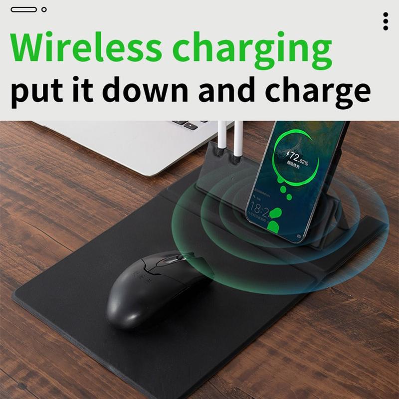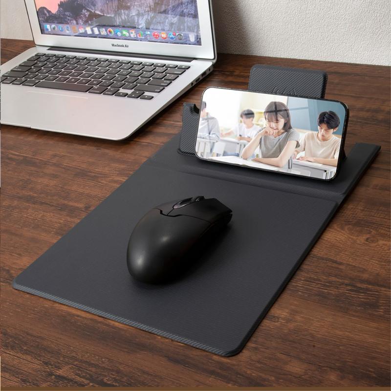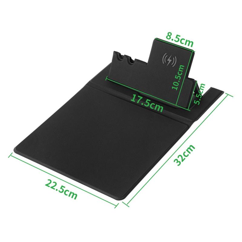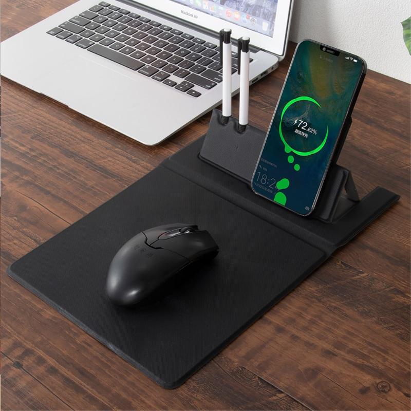 De leren muismat heeft een drie-in-één ontwerp van 15W draadloze mobiele telefoonlader, penhouder en muismat.
