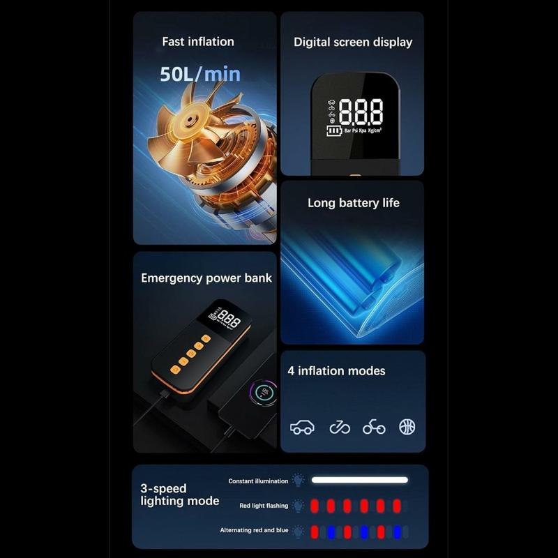 In tegenstelling tot lompe traditionele luchtcompressoren is dit draadloze digitale vulapparaat licht van gewicht, draagbaar en eenvoudig te gebruiken. Het slimme display, de vooraf ingestelde modi en de krachtige pompsnelheid maken het een praktische metgezel voor veilig rijden en een actieve levensstijl.