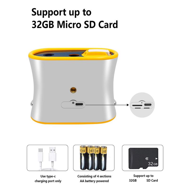 De DT15 wordt gevoed door 4 × AA-batterijen of Type-C opladen, waardoor het handig is voor reizen en gebruik buitenshuis. Dankzij het lichtgewicht ontwerp en het meegeleverde koord kunnen kinderen hem veilig en comfortabel dragen. De opslagruimte kan worden uitgebreid met een microSD-kaart van 32 GB (niet meegeleverd).